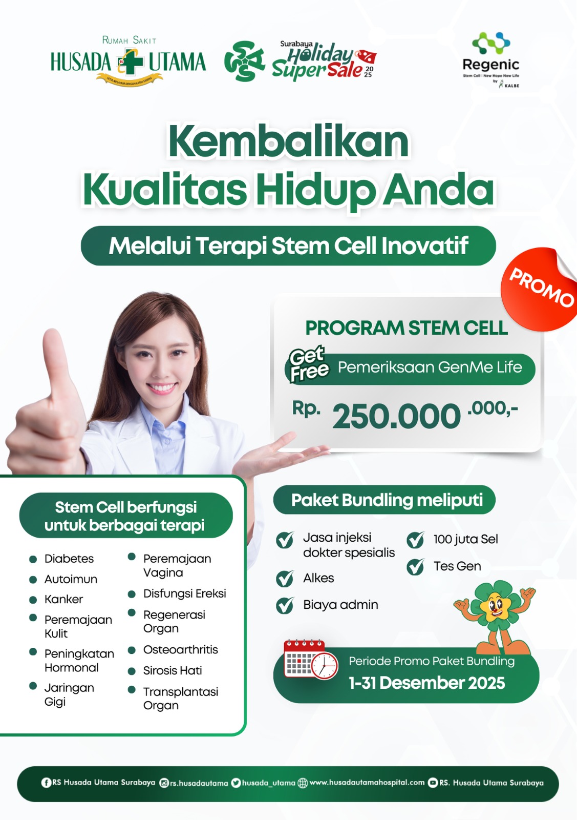 Ada kabar baik nih buat kamu yang ingin hidup lebih sehat, lebih bugar, dan lebih percaya diri. RS Husada Utama lagi punya program Terapi Stem Cell Inovatif dengan promo spesial yang sayang banget kalau kamu lewatkan!
